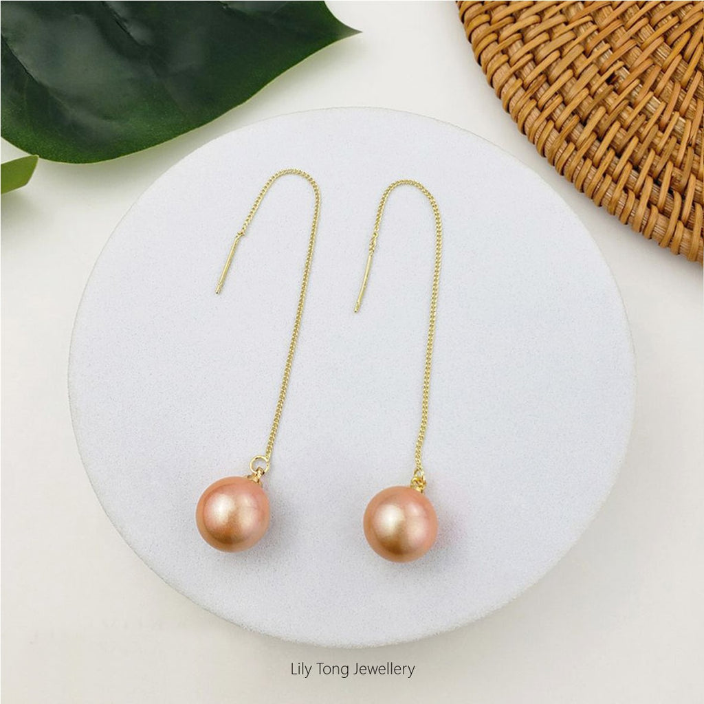 12mm Shell Pearl Drop Threader Earrings #T112 Apricot Pink