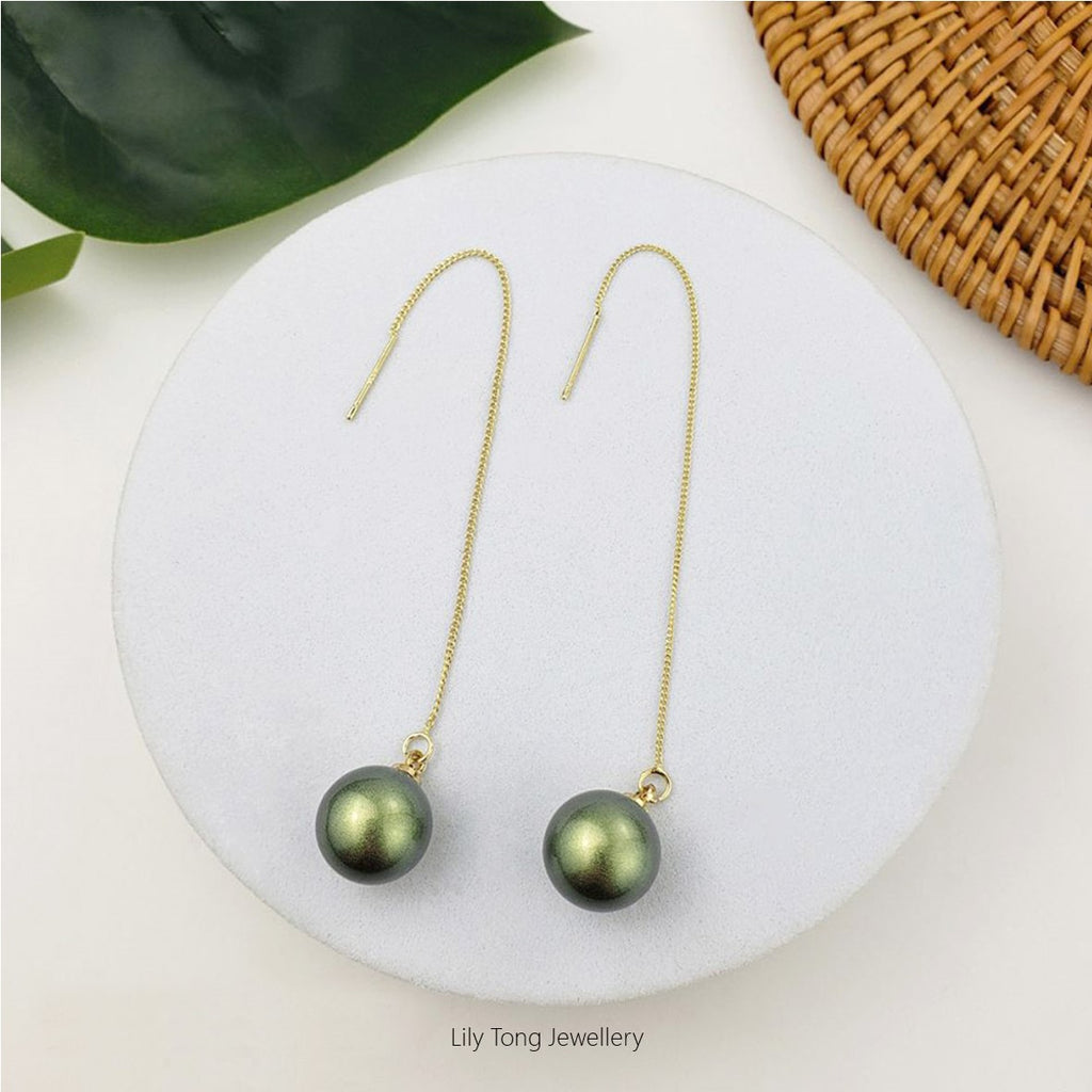 12mm Shell Pearl Drop Threader Earrings #T115 Dark Green