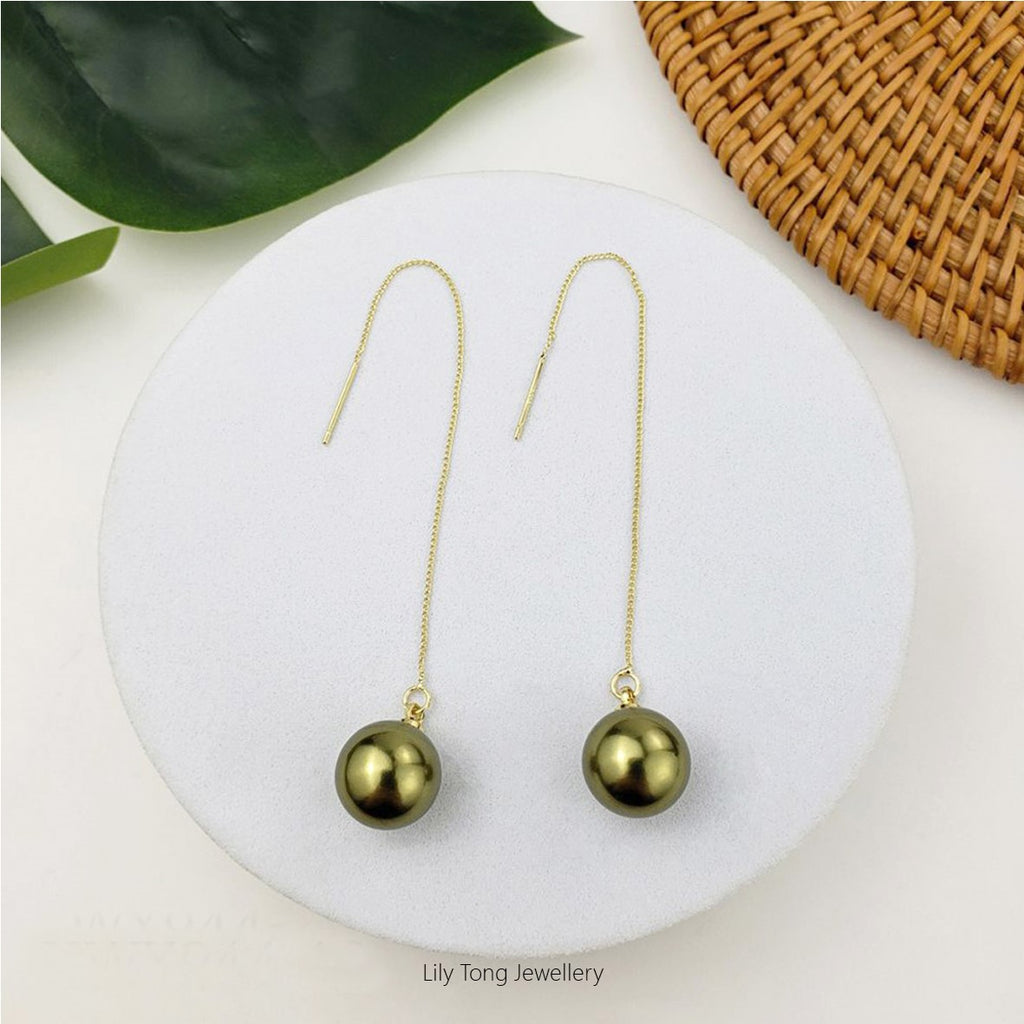 12mm Shell Pearl Drop Threader Earrings #T116 Olive Green