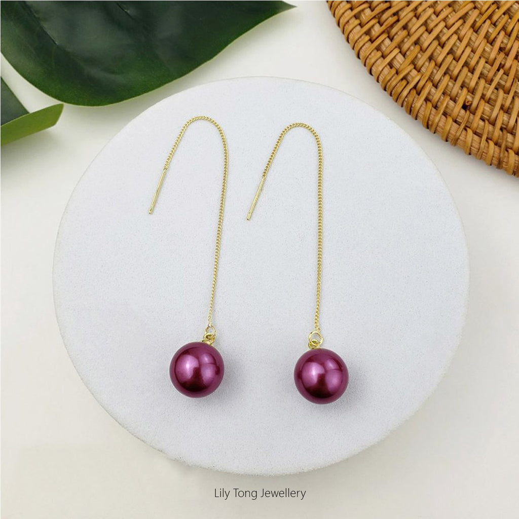 12mm Shell Pearl Drop Threader Earrings #T122 Red Violet