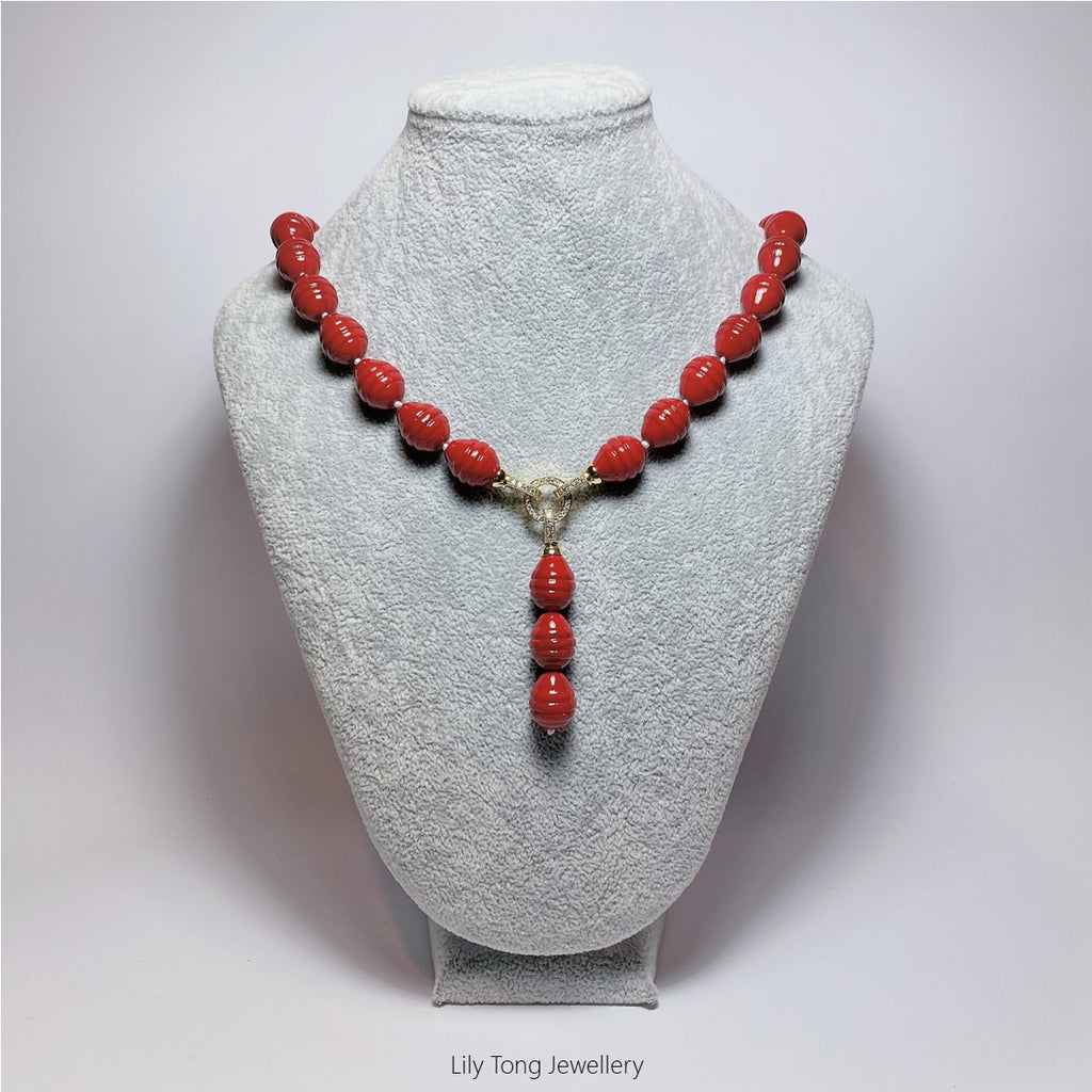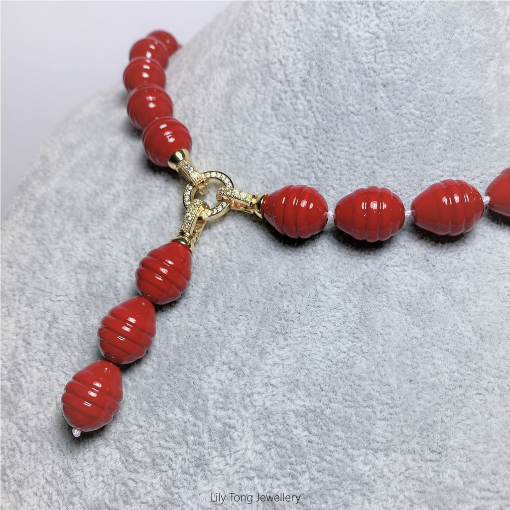 Drop Shell Pearl 3-Bead Pendant Necklace (Deep Red)