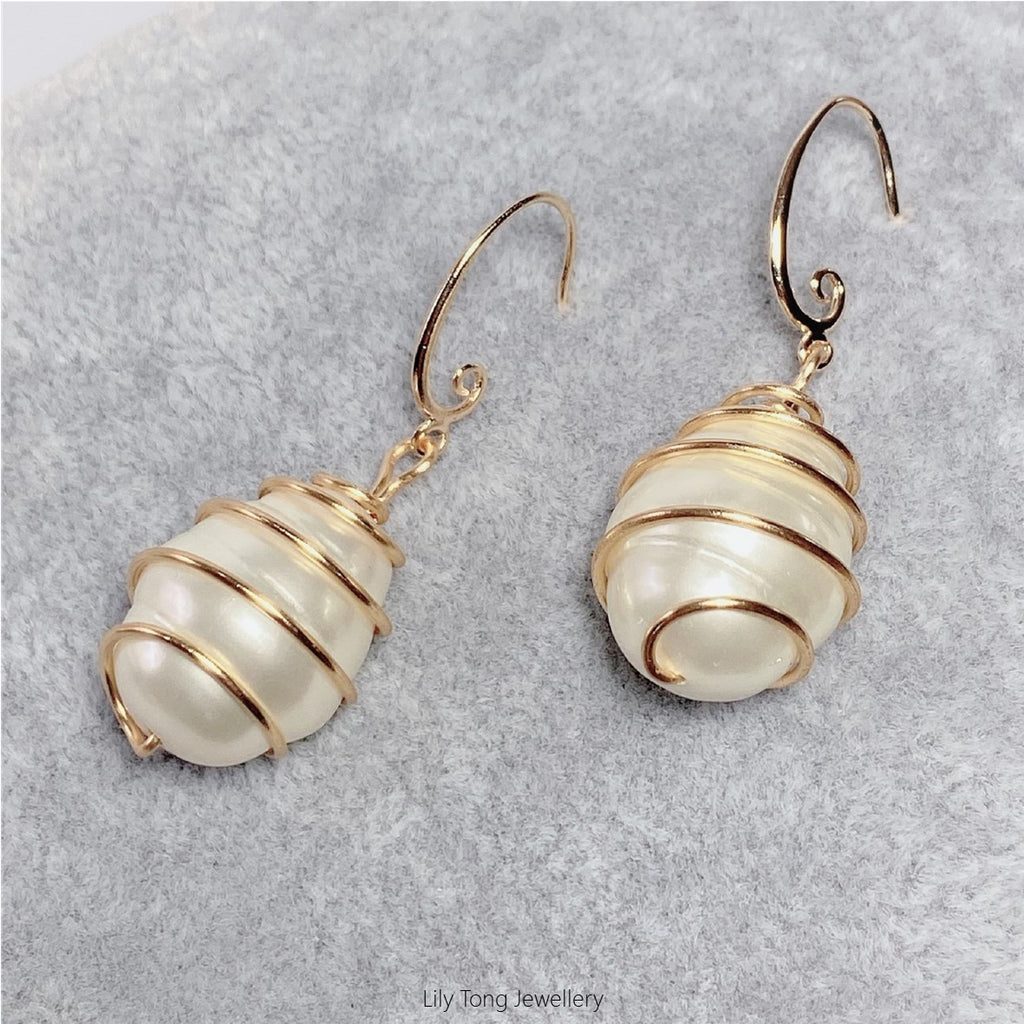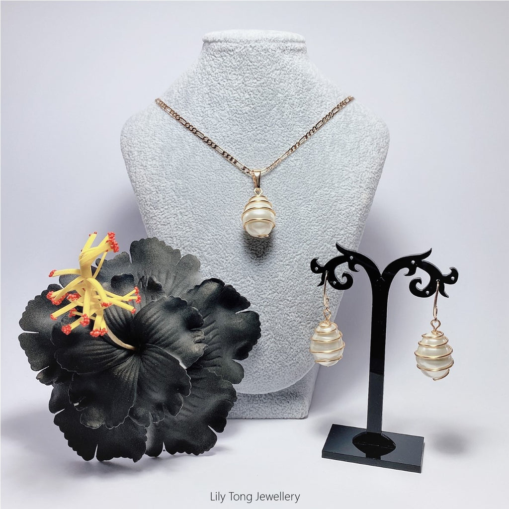 Gold-Filled Spiral Caged Shell Pearl Jewellry Set (White)