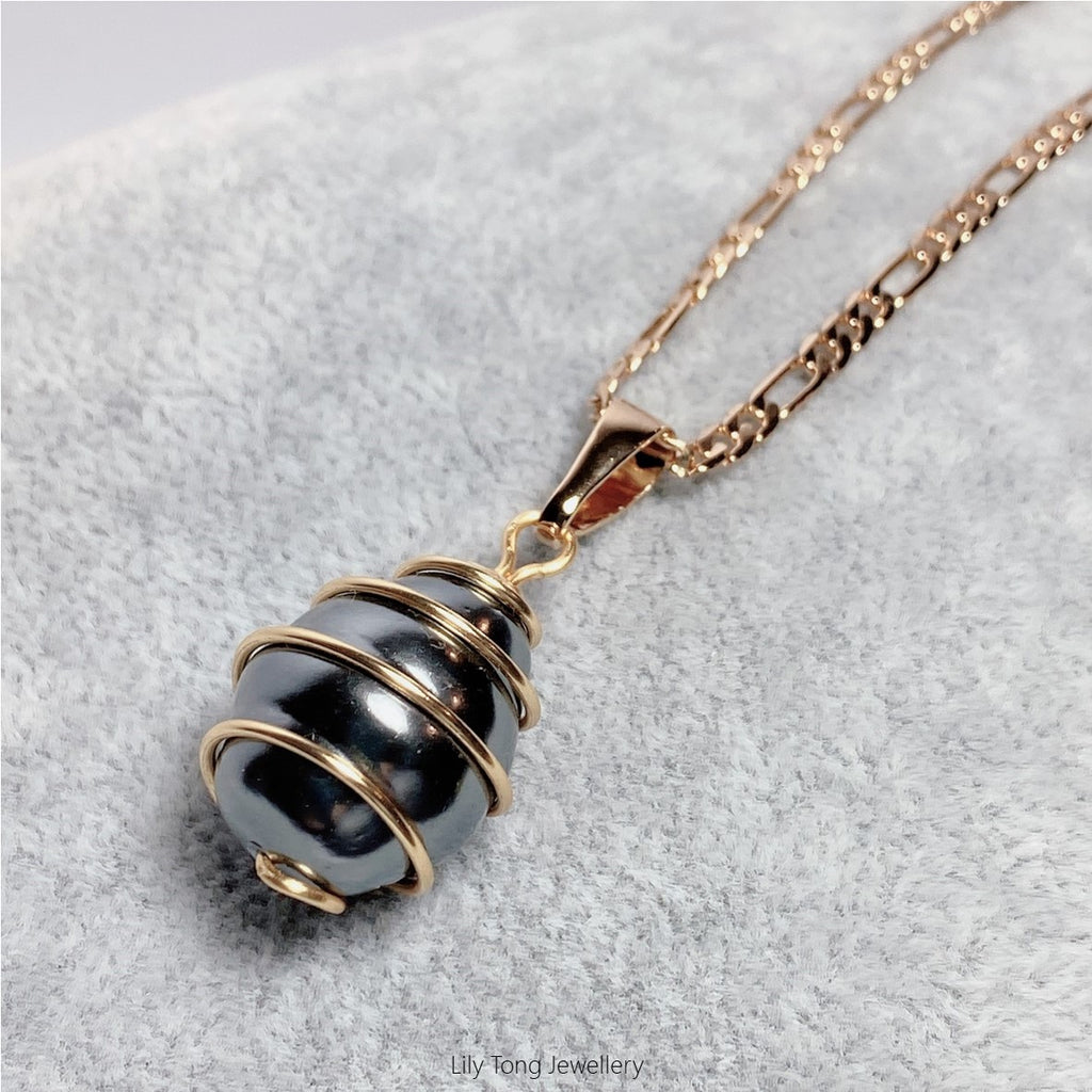 Gold-Filled Spiral Caged Shell Pearl Pendant Necklace (Glossy Dark Grey)