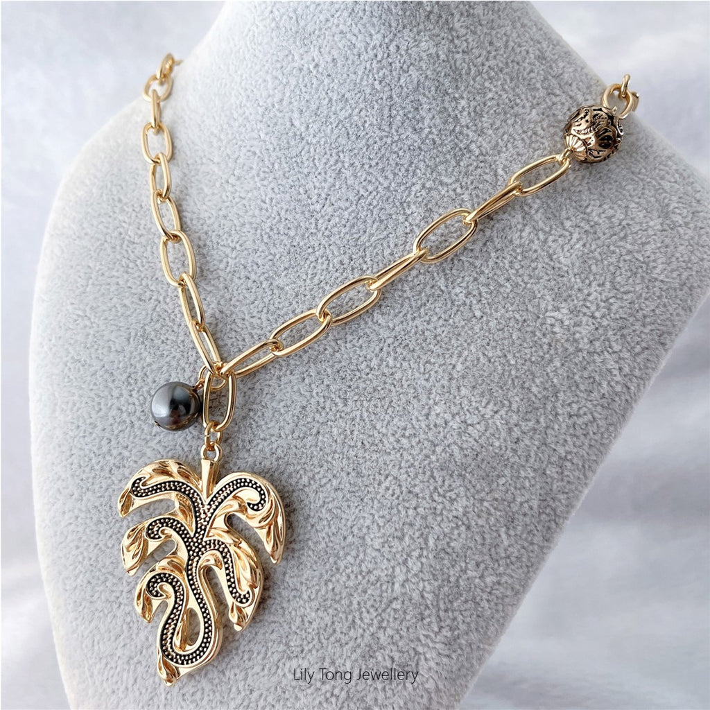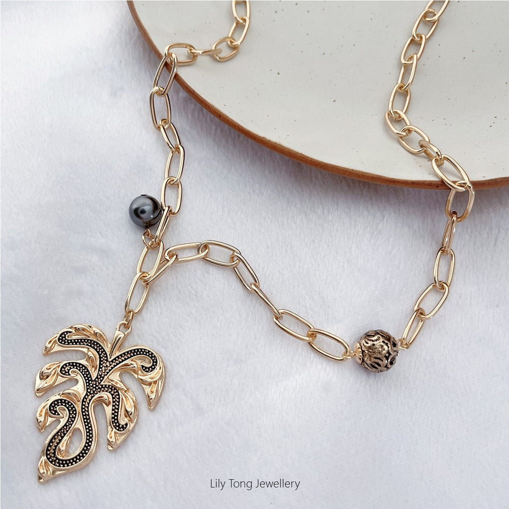 Link Chain Necklace With Shell Pearl, Carved Bead & Leaf Pendant #NSH2