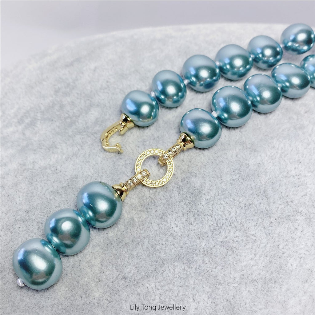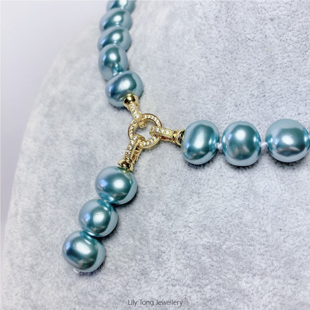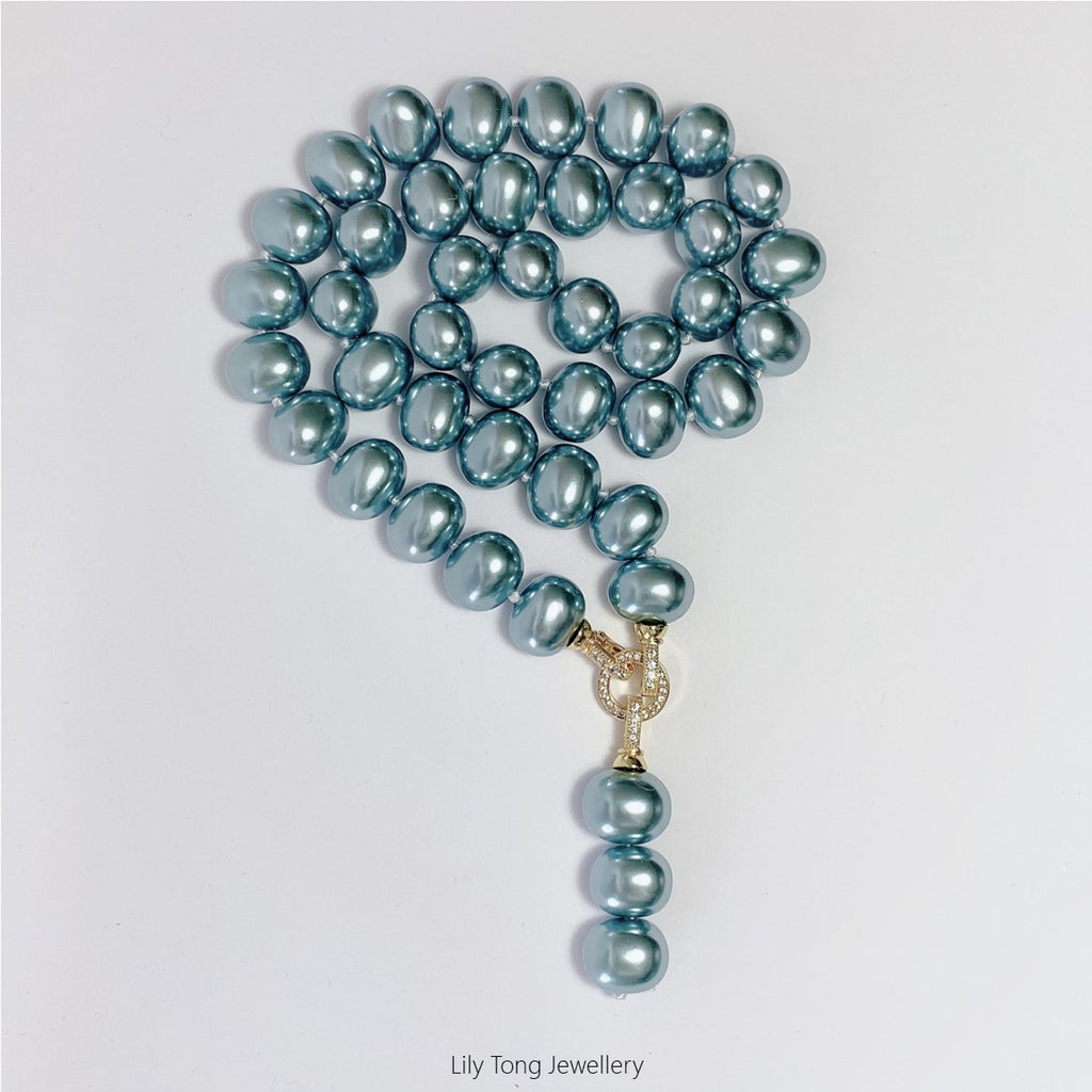 Oval Shell Pearl 3-Bead Pendant Necklace #0605