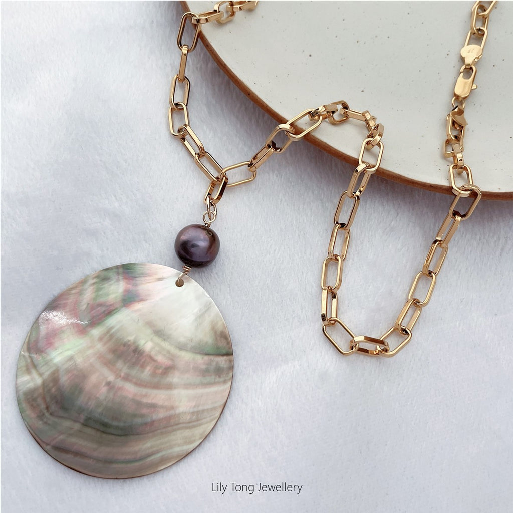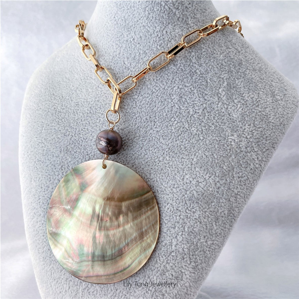 Round Shell & Baroque Pearl Pendant Link Chain Necklace