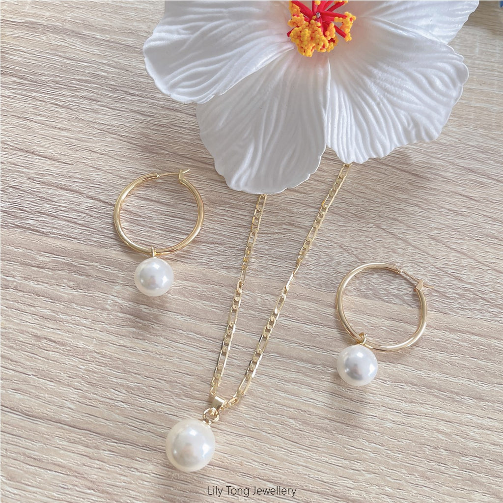 Gold Plated Shell Pearls Necklace & Hoop Earrings Set