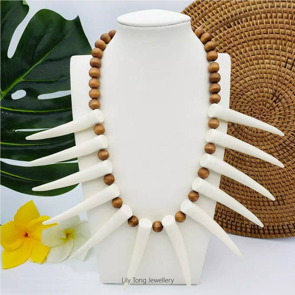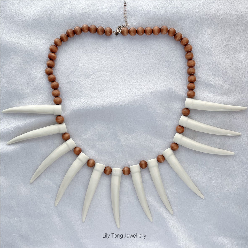Wooden Bead Acrylic Ivory & Bead Chain Chunky Style Necklace #NOT3-1